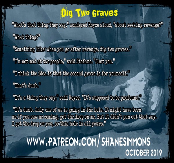 I’m wrapping up the week with the final three tales in the Dimestore Crime Stories promotion on Patreon. Both “A Foot in the Door” and “Dig Two Graves” will appear in the upcoming collection, Petty Crimes and Vindictive Criminals. Back me for just one dollar and receive early access to all ten stories (basically half the book) today.