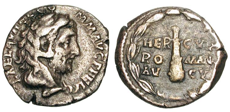 Somewhat shabby, but good as a denarius from Commodus goes. Note the lionskin headdress and club that equates him with Hercules. He thought he was Hercules reborn. What an asshole.