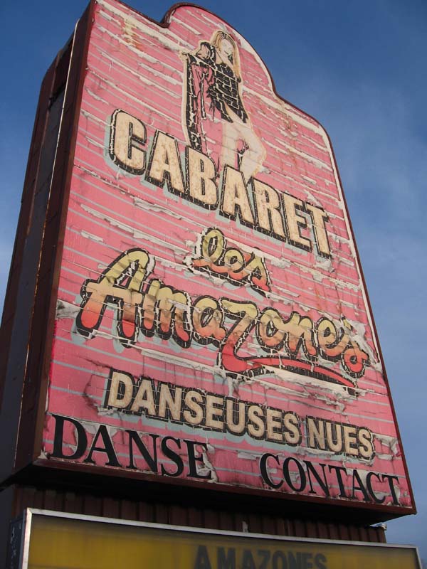 Cabaret Les Amazones is the lone strip club on the street. Montreal has no shortage of strip clubs and has been a target destination for many a south-of-the-border youth looking for a titty-bar smorgasbord and a lower legal drinking age for decades. The fact that Amazones is the only business of its kind the area can support goes to show what an economic dead zone St. Jacques has become. Its weather-beaten and decayed sign towers at the side the road, beckoning commuters with promises of nudity and contact. The single uninviting entry point leads directly downstairs, into whatever debauched dungeon lies beneath the skeletal remains of Picasso.