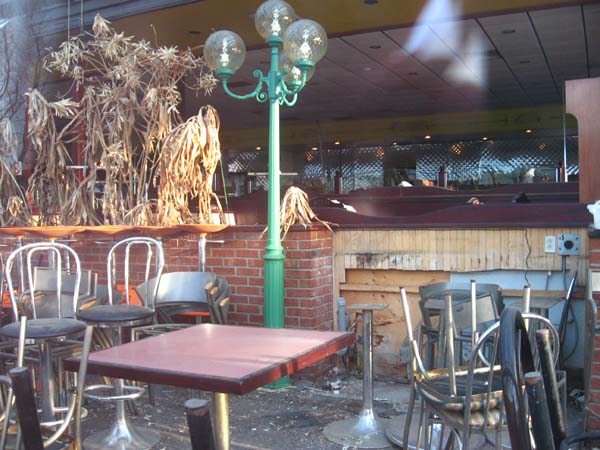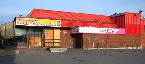We pulled into the nearly vacant parking lot after nightfall. It was still early as bar-hopping/clubbing goes, but the giant grid of empty paved spaces, shared with a neighbouring supermarket, seemed particularly barren after hours on a Saturday night. Stopping for a quick look through the dark windows of the Picasso ruins, we noted a light on in the kitchen that suggested it was still being used to serve up food to the club customers below.