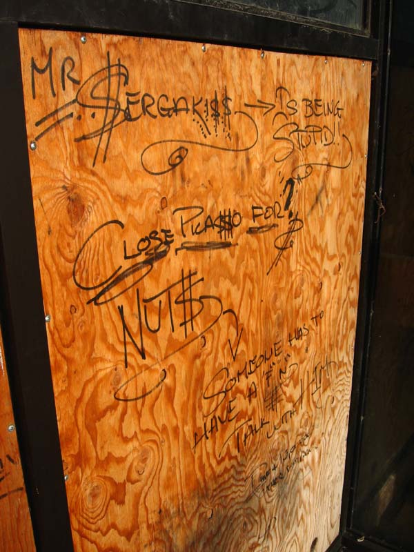 Picasso’s boarded-up west-side entry and the door to the debauchery below.