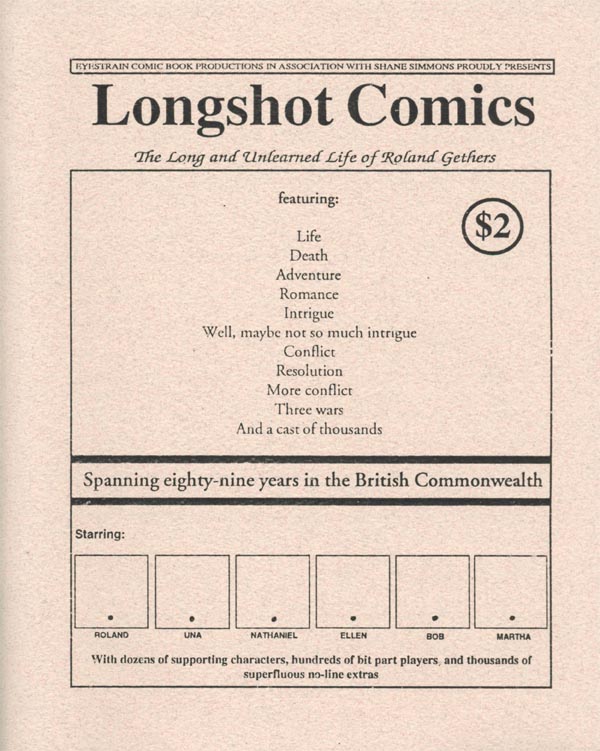 Image Posted by Shane Simmons Posted on October 27, 2013 Posted in longshot1origmini Comments Leave a comment longshot1origmini Longshot Comics Book One: The Long and Unlearned Life of Roland Gethers, second minicomic edition, 1993 Size: 600 × 751 Post a comment or leave a trackback: Trackback URL.