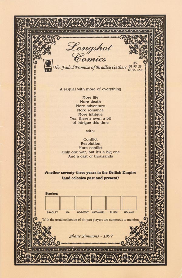Image Posted by Shane Simmons Posted on October 27, 2013 Posted in longshot2slg Comments Leave a comment longshot2slg Longshot Comics Book Two: The Failed Promise of Bradley Gethers, Slave Labor Graphics Edition, 1997 Size: 600 × 918 Post a comment or leave a trackback: Trackback URL.